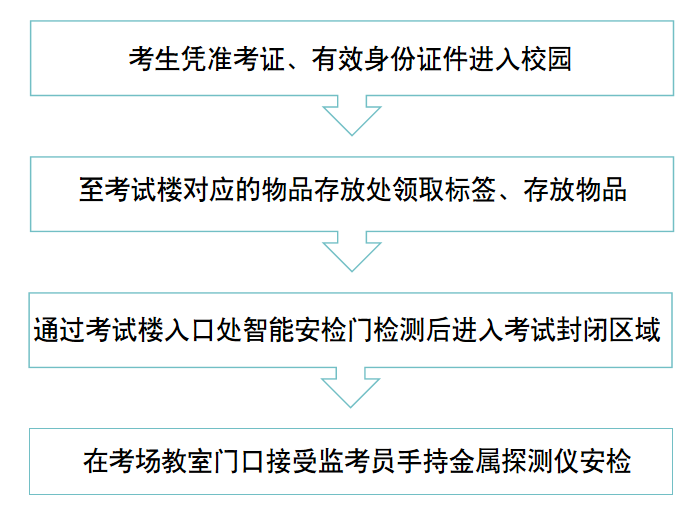 考生通过智能安检门时,如遇发现携带疑似违规物品、提示异常等情况的,须在考生物品存放处寄存,再次通过“智能安检门”检查确认无误后,方可入场考试。