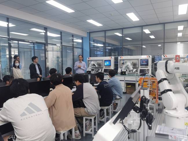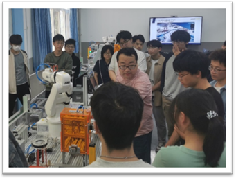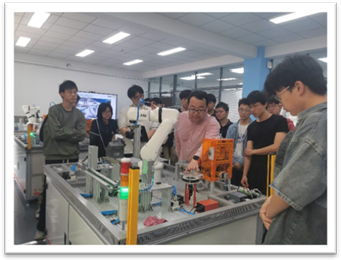刘月明介绍了工业机器人在中国工业智能制造化过程中的重要作用,希望学生充分体验并了解机械类专业集成机械、电子、计算机综合应用的课程实验教学内容,初步认知学院面向智能制造、轨道交通、航空航天、新能源汽车开展“装备+信息”教学特色。