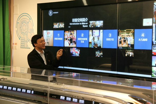王瑽一行饶有兴趣地了解了大学生机械博物馆的馆藏特色、陈列布局、讲解服务等方面情况以及在传播爱路报国精神方面所开展的工作,表示校史博物馆与大学生机械博物馆可以在征集藏品、讲解员培训及相互宣传推广等方面加强协同合作,共同打造交大博物馆文化品牌。王瑽一行还体验了由学生自主开发的虚拟成像项目和骑行发电项目。