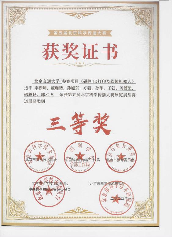 近日,第五届北京科学传播大赛获奖名单揭晓。机电学院教师李振坤及所带学生团队参加的“磁控4D打印及软体机器人”项目在上千个项目中脱颖而出,荣获第五届北京科学传播大赛展览展品赛道三等奖。
