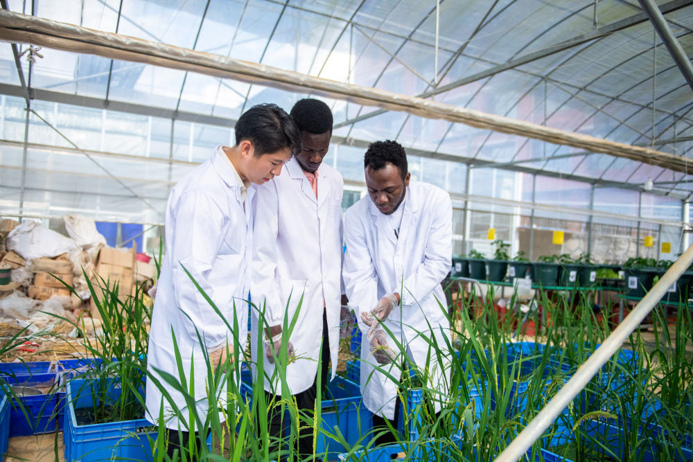 2023年6月26日,湖南农业大学博士生、尼日利亚青年尼克(右)和同学在学校教学温室大棚查看水稻长势。新华社记者 陈思汗 摄