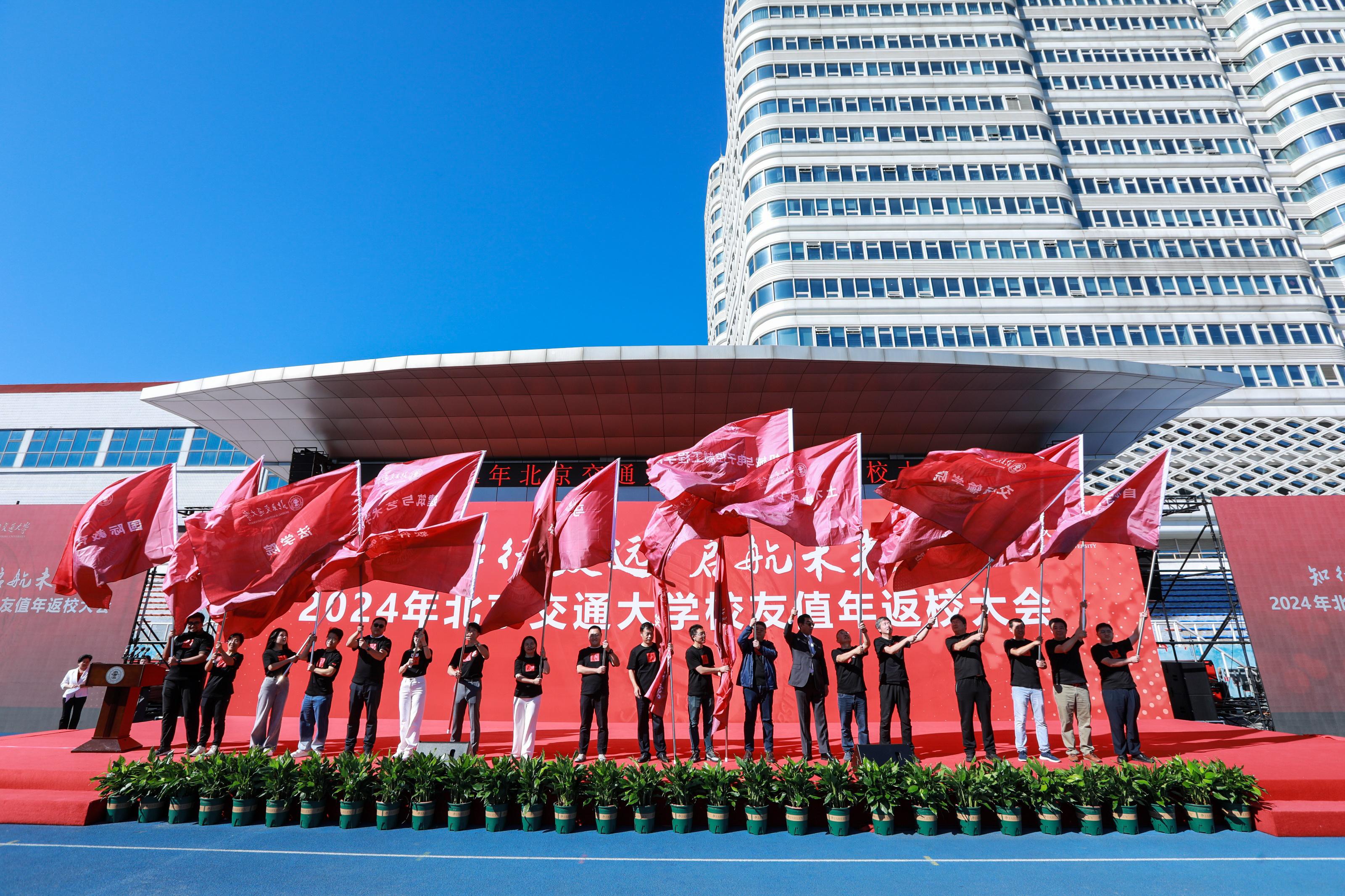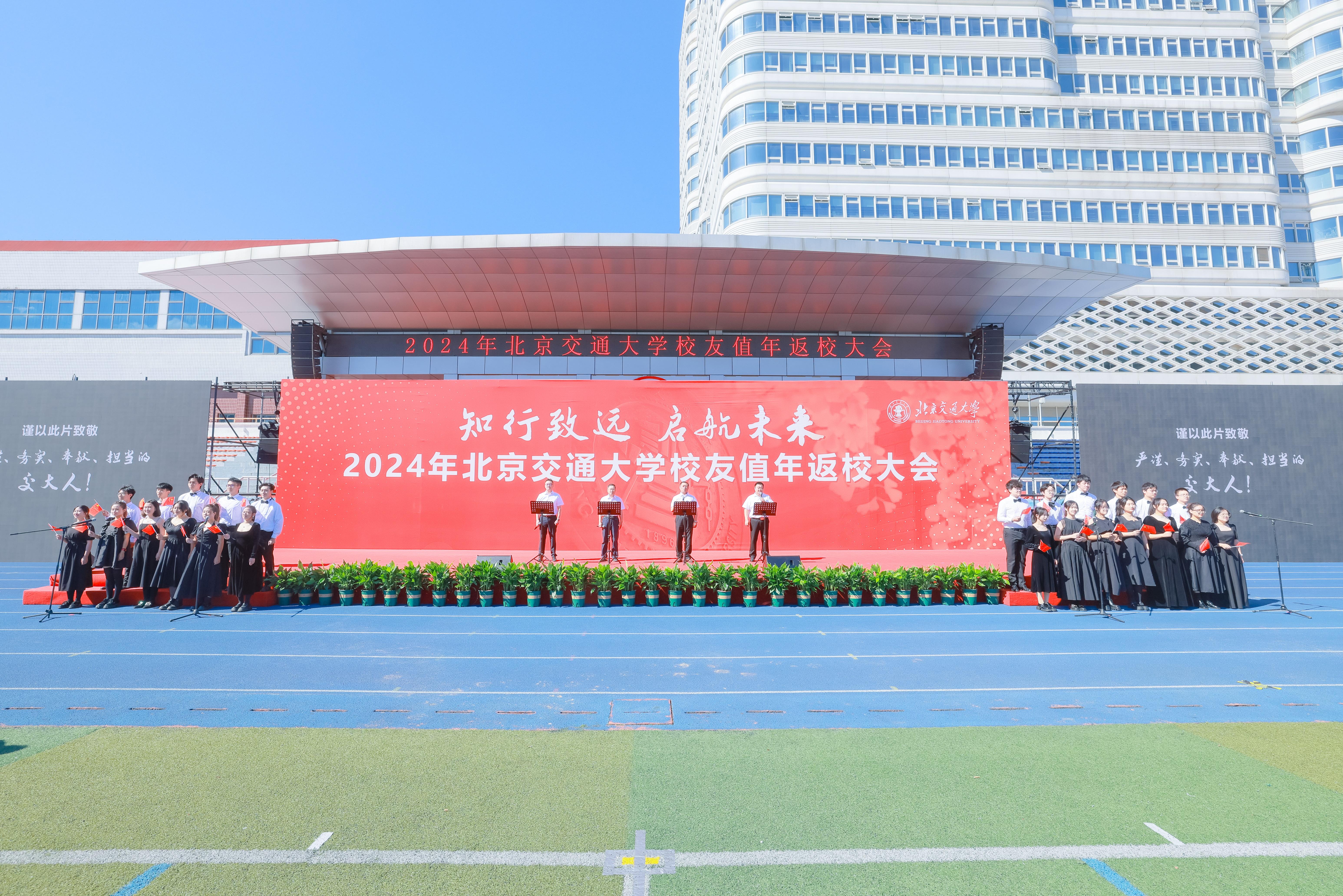大会现场,在电子信息工程学院教授艾渤、经济管理学院教授张明玉、交通运输学院教授姚恩建、土木建筑工程学院教授袁大军的带领下,校友代表们齐声高唱歌曲《我和我的祖国》,为中华人民共和国成立75周年献礼。