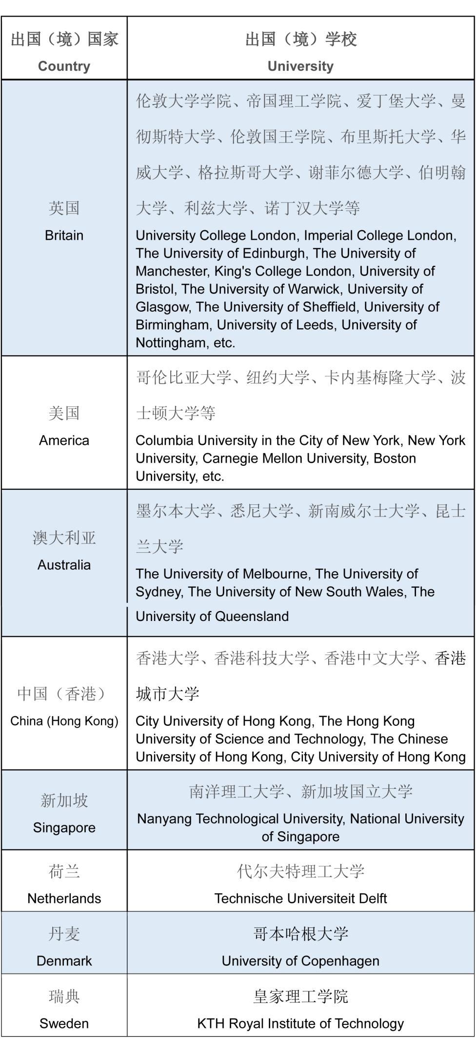 澳洲国立大学、墨尔本大学、悉尼大学、新南威尔士大学、昆士兰大学、莫纳什大学、西澳大学 Australian National University, University of Melbourne, University of Sydney, University of New South Wales, University of Queensland, Monash University, University of Western Australia |